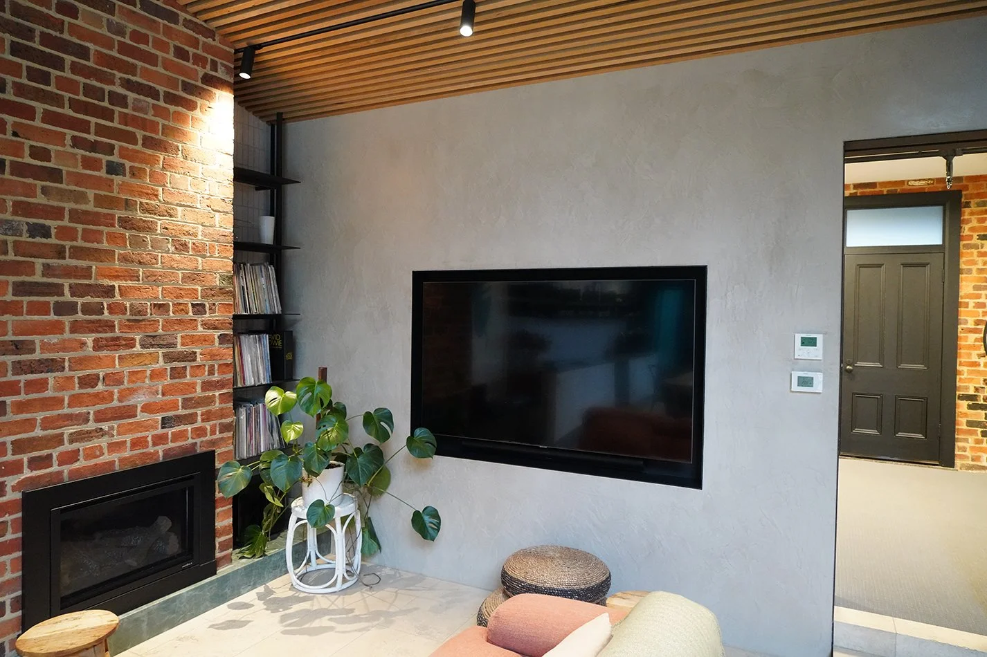 The Darling St, South Yarra project featured 'CP Marmorino' plaster throughout the home, transitioning from crisp white in the hallway to warm beiges in the main spaces.